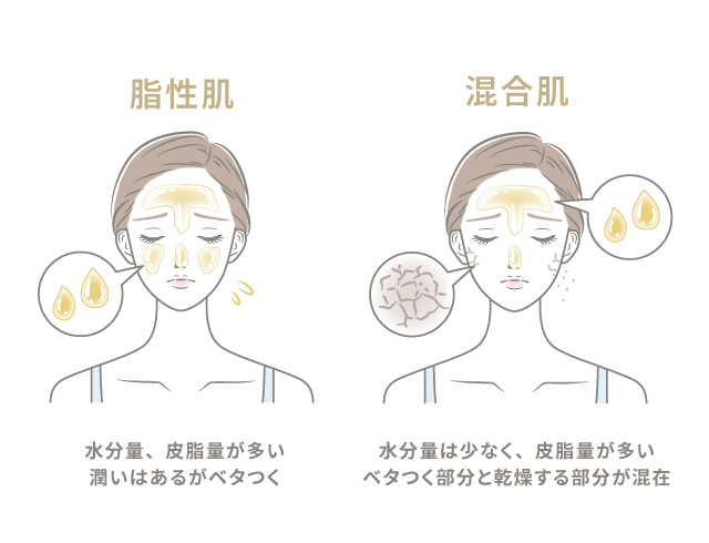 脂性肌→ 顔全体が油っぽくベタつきやすい 混合肌→ ベタつく部分と乾燥する部分が混在する |