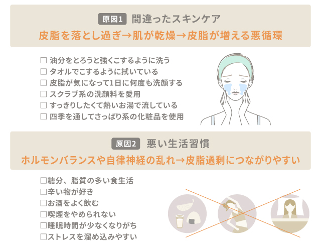 肌に必要な潤いまで奪ってしまったり、強い刺激を与えたりすることは、かえって皮脂の過剰分泌を招き、悪循環に陥ってしまう原因になります。