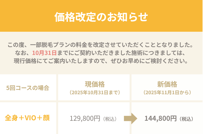 全身+VIO+顔脱毛 | 149,300円 | 208,500円 | 263,200円 |