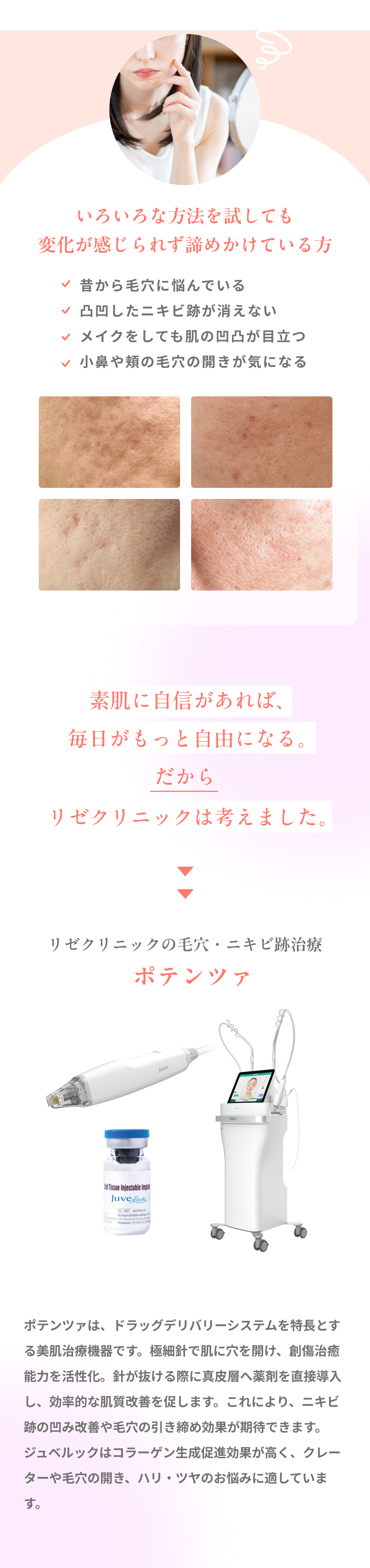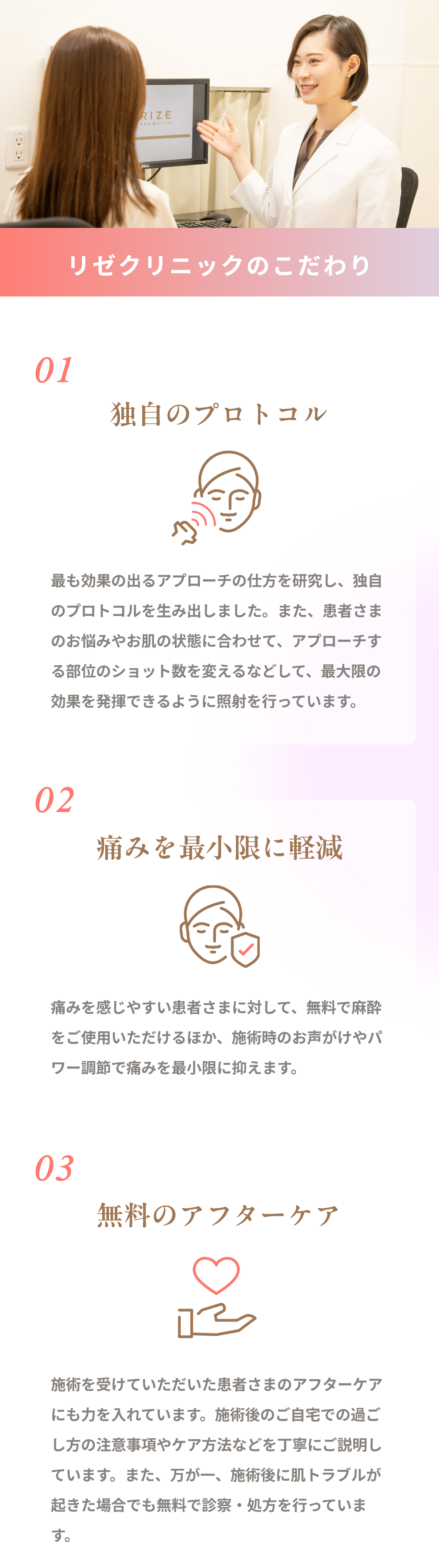 お肌やお体の状態を確認して施術の可否判断をし、リスクや麻酔について説明します。
