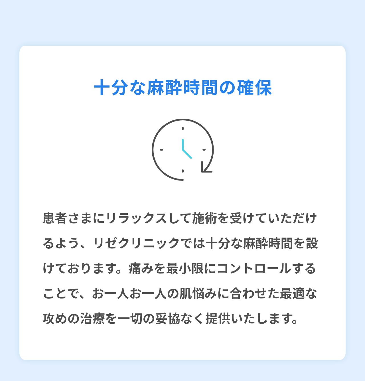 痛みの感じ方には個人差がありますが、施術前に麻酔クリーム使用し、痛みを抑えることが可能です。