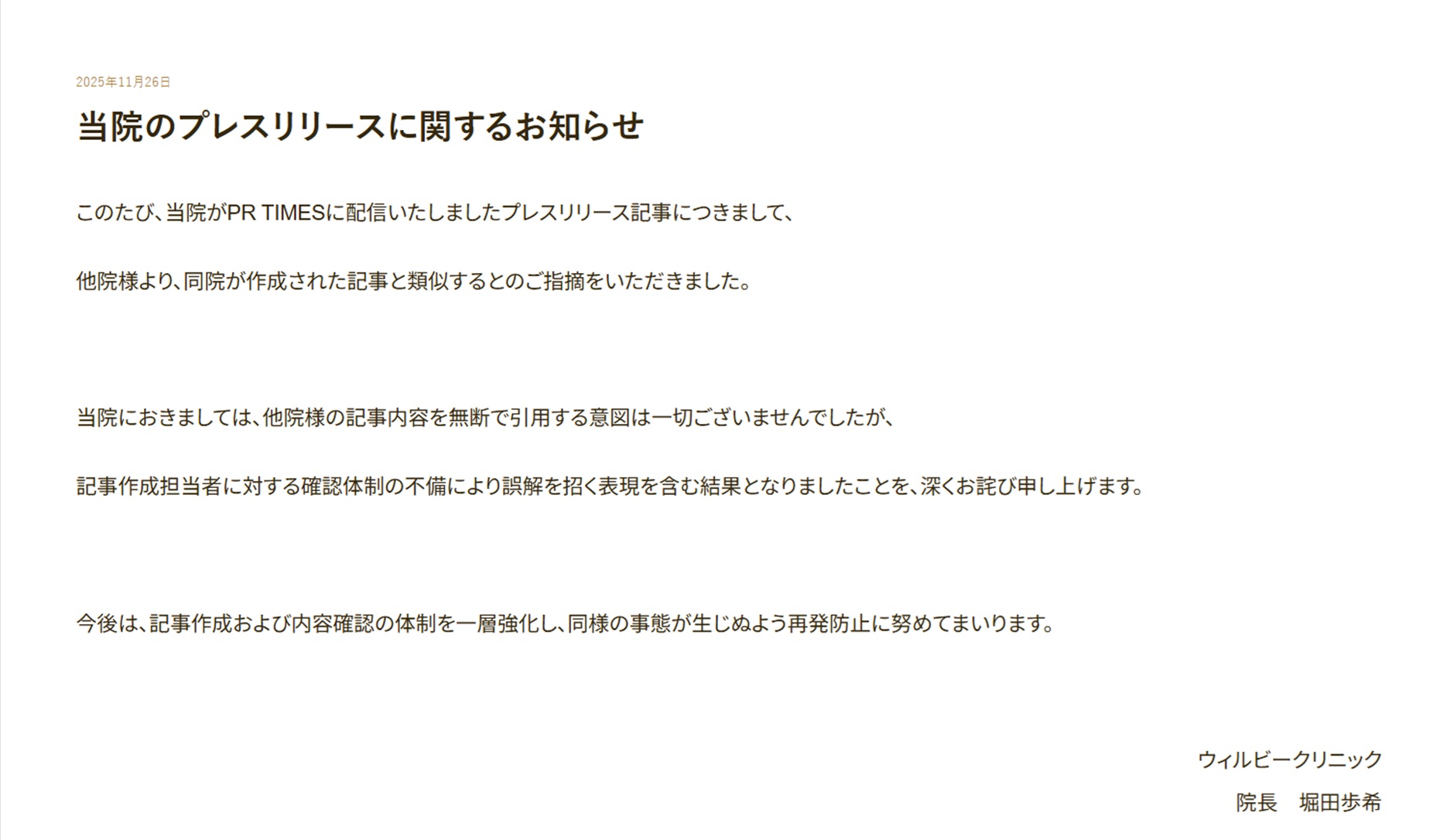 平素より格別のご愛顧を賜り、厚く御礼申し上げます。 2025年6月30日付にて、当院発信のプレスリリースおよび医師見解に関し、 酷似・無断利用(盗用)の可能性について「調査中」である旨をご共有しておりましたが、 このたび、該当医療機関より公式サイト上に謝罪文が掲載され、当件は解決に至りましたことをご報告申し上げます。