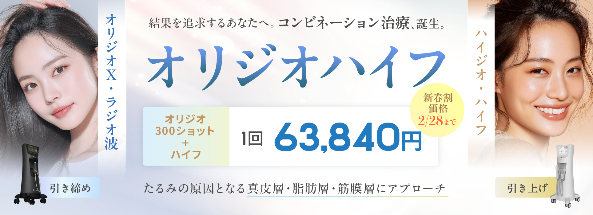 ハイジオ(ハイフ)は、皮膚の土台となる筋膜層(SMAS)に超音波の熱エネルギーを照射することで、内側から組織を引き上げ、リフトアップ効果が期待できます。アプローチの異なる2つの施術を組み合わせることで強力な小顔・リフトアップ効果が見込めます。